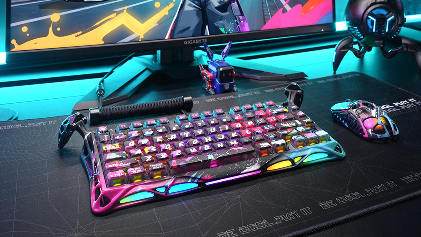 Gravastar V75 ProのRGBバックライトシステムは、16段階のダイナミックモードとデュアルゾーンコントロールを搭載。キーボードのキーとサイドのアンビエントライトが同期し、臨場感あふれるビジュアルを実現します。色相、彩度、明るさ、エフェクトのスピードを調整したり、モードを切り替えたりすることで、自分だけのオリジナルルックを演出できます。躍動感あふれる戦闘エフェクトでゲームを楽しんだり、柔らかなアンビエントライトの下でタイピングを楽しんだりするのに最適です。細部までカスタマイズでき、制限はありません。