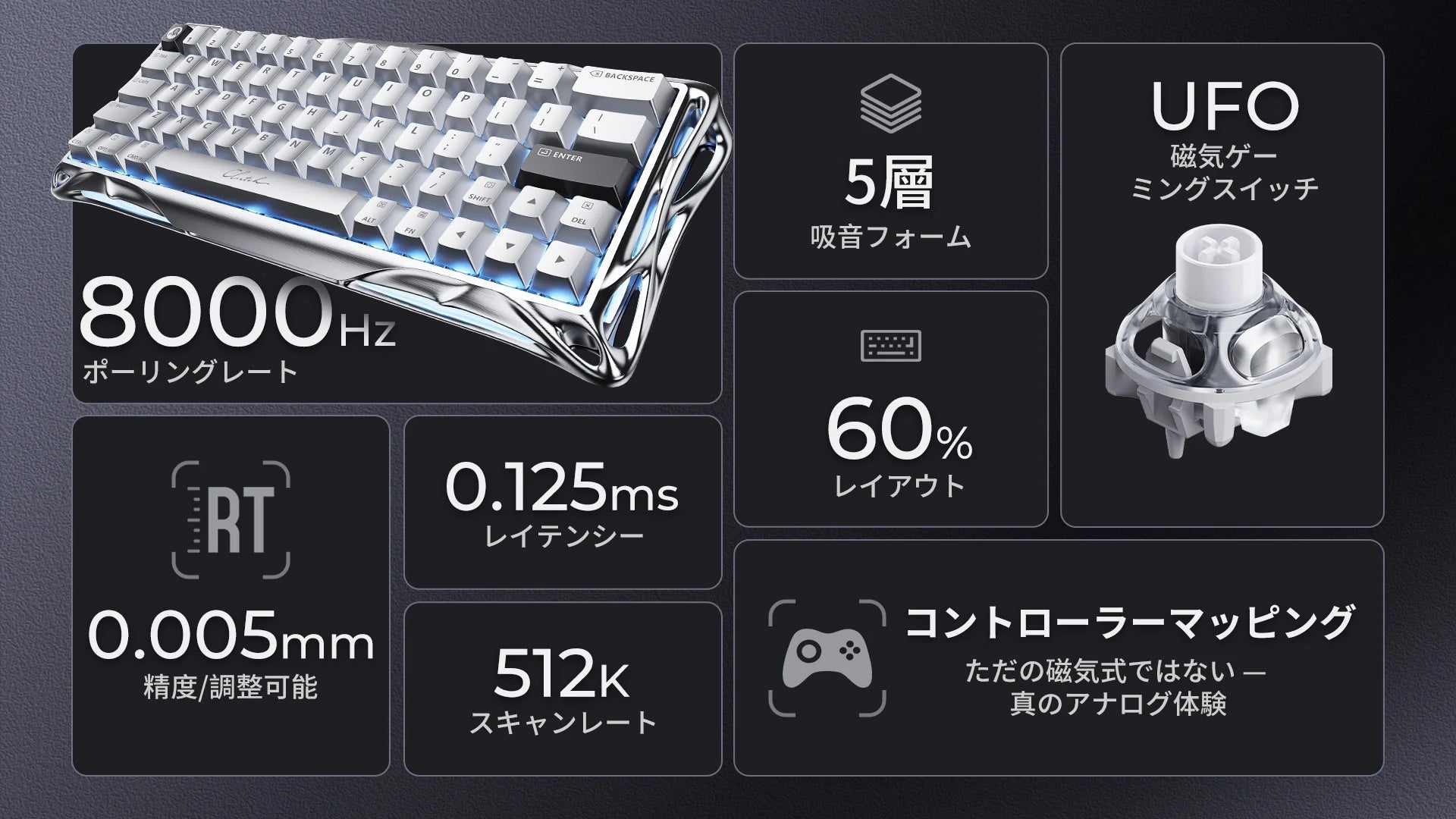 キー押下の遅延を排除。キーは動的に作動・解除し、高速ストレイフ、タップ、コンボに最適。