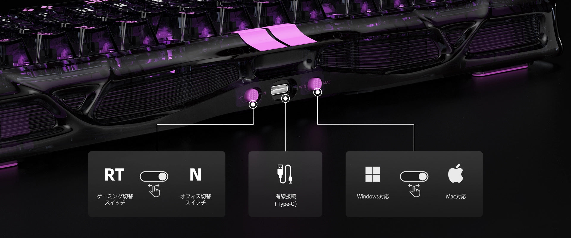- ラピッドトリガーモード:キーの「引っかかり」を排除し、上方向の移動で即座にリセット。素早い再押下と入力切替が可能。