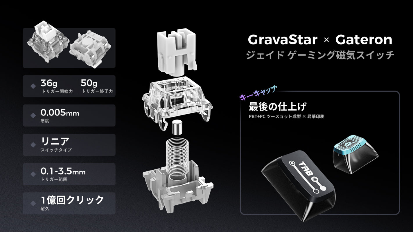 - GravaStar × Gateron マグネティック・ジェイド・ゲーミングスイッチ:0.005mmの精度で設計され、0.1mm〜4.0mmの調整可能なトリガー深度によりラグを排除し、操作性を向上。
