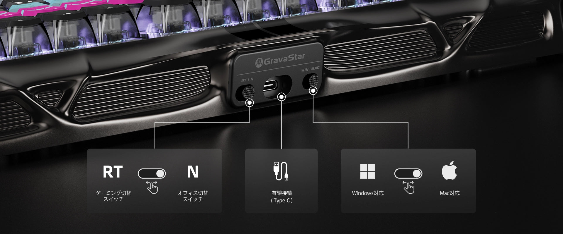 - 6種類のモード、デュアルシステム、マルチゾーンRGBライティング:キーと側面ライトのゾーンごとの制御、16のダイナミックモード、色相・彩度・明るさの調整が可能。