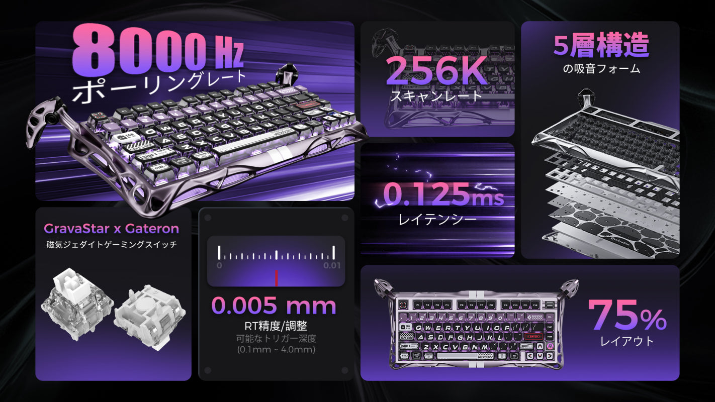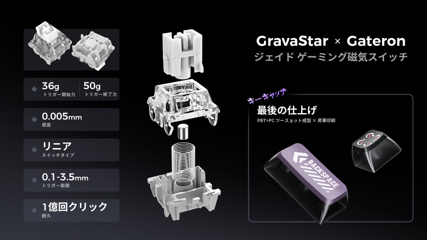 - GravaStar × Gateron マグネティック・ジェイド・ゲーミングスイッチ:0.005mmの精度で設計され、0.1mm〜4.0mmの調整可能なトリガー深度によりラグを排除し、操作性を向上。
