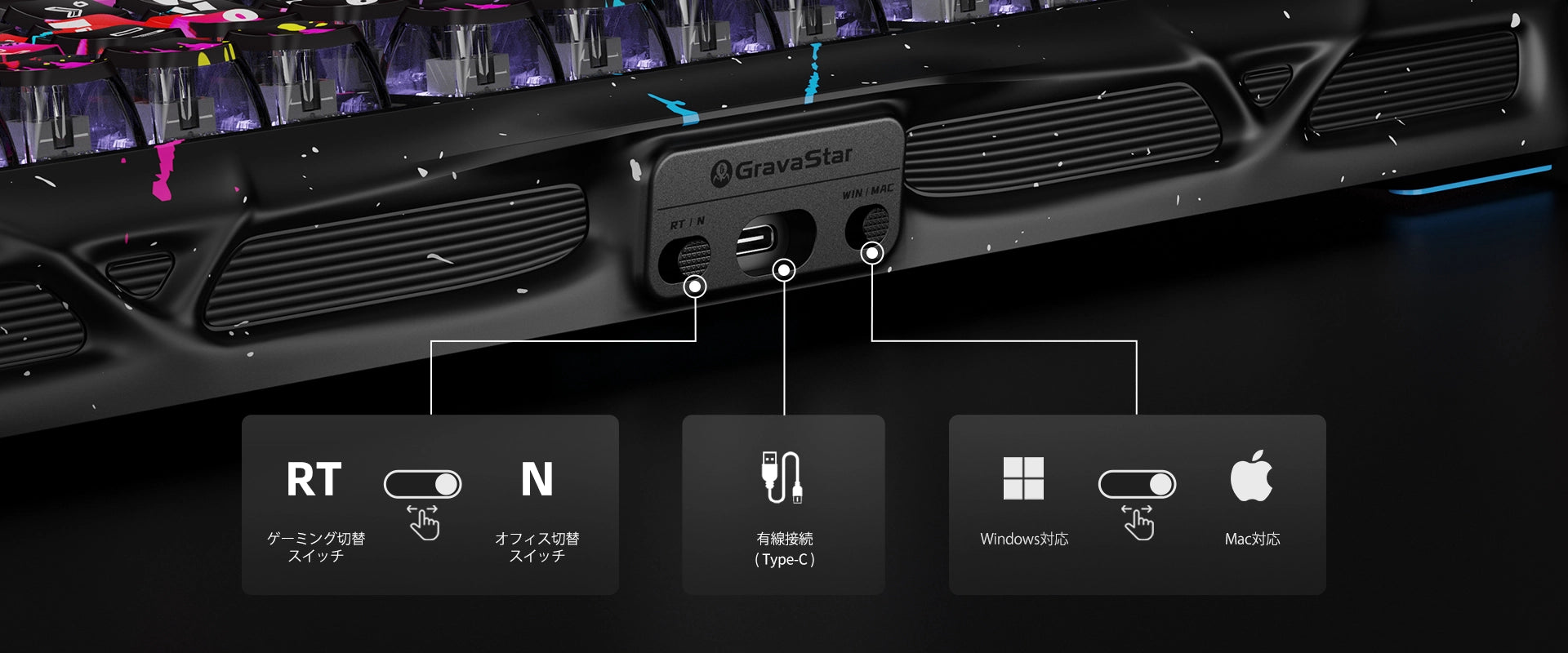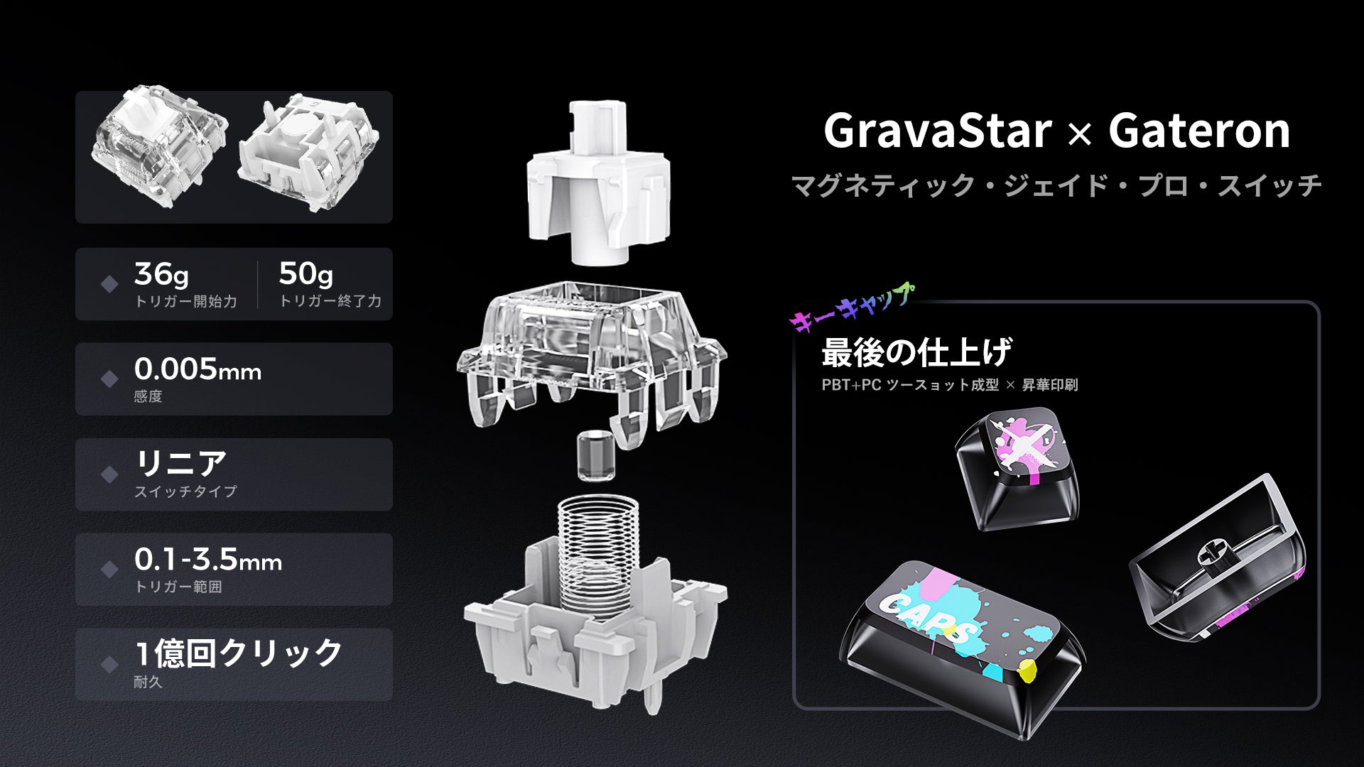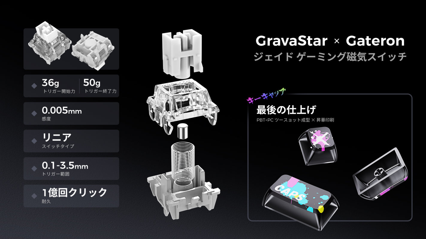 - GravaStar × Gateron マグネティック ジェイド ゲーミングスイッチ:0.005mm の精度と調整可能なトリガー深度(0.1mm~4.0mm)で設計されており、ラグを排除し、コントロール性を向上。